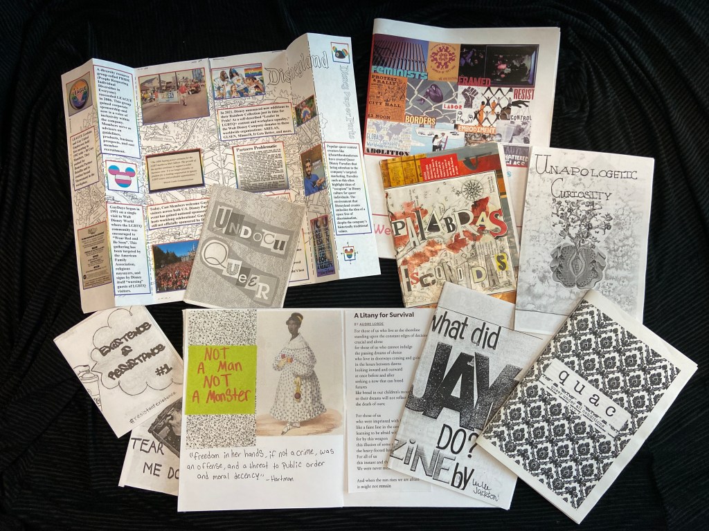 Zines—typically associated with small, hand-made, analog, low-cost, low-circulation publications—are literally unbound (traditional zines are often made from a single, folded sheet of paper) while metaphorically conveying a sense of unboundedness. Zines are vital forms of communication and community formation, and become “world-making” spaces for imagining future possibilities. Zines are not only or primarily spaces of self-expression, but they are also microcosms for cultural critique, memory, and counter-archiving for those lives and knowledges written out of official histories.